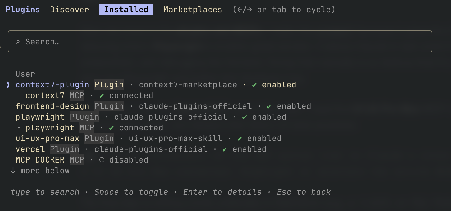 Plugins: context7 for best practices, ui-ux-pro-max for design, playwright for testing.
