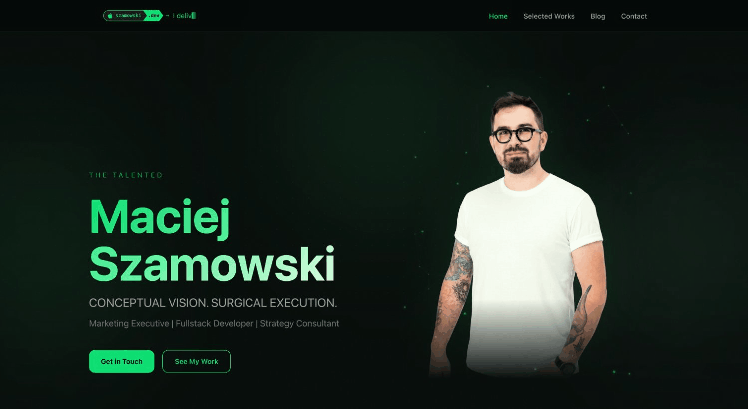 The idea was simple: build a personal website that sells me as a consultant, a freelancer, and a "digital one-man army." The name? The Talented Mr. Szamowski, a direct reference to The Talented Mr. Ripley. I liked the vibe. It suggests versatility, resourcefulness, and a hint of mystery.