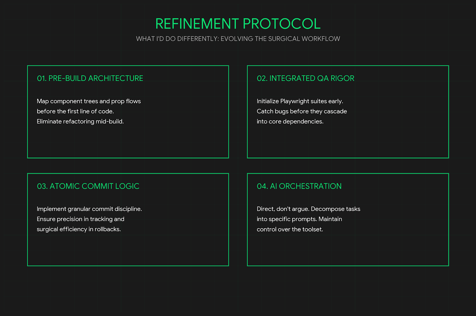 Stricter testing from the start. I introduced Playwright tests gradually, but I should have set up the test suite from the very first component. When you test late, you find bugs that are deeply embedded in your code. When you test early, you catch them before they cascade.
