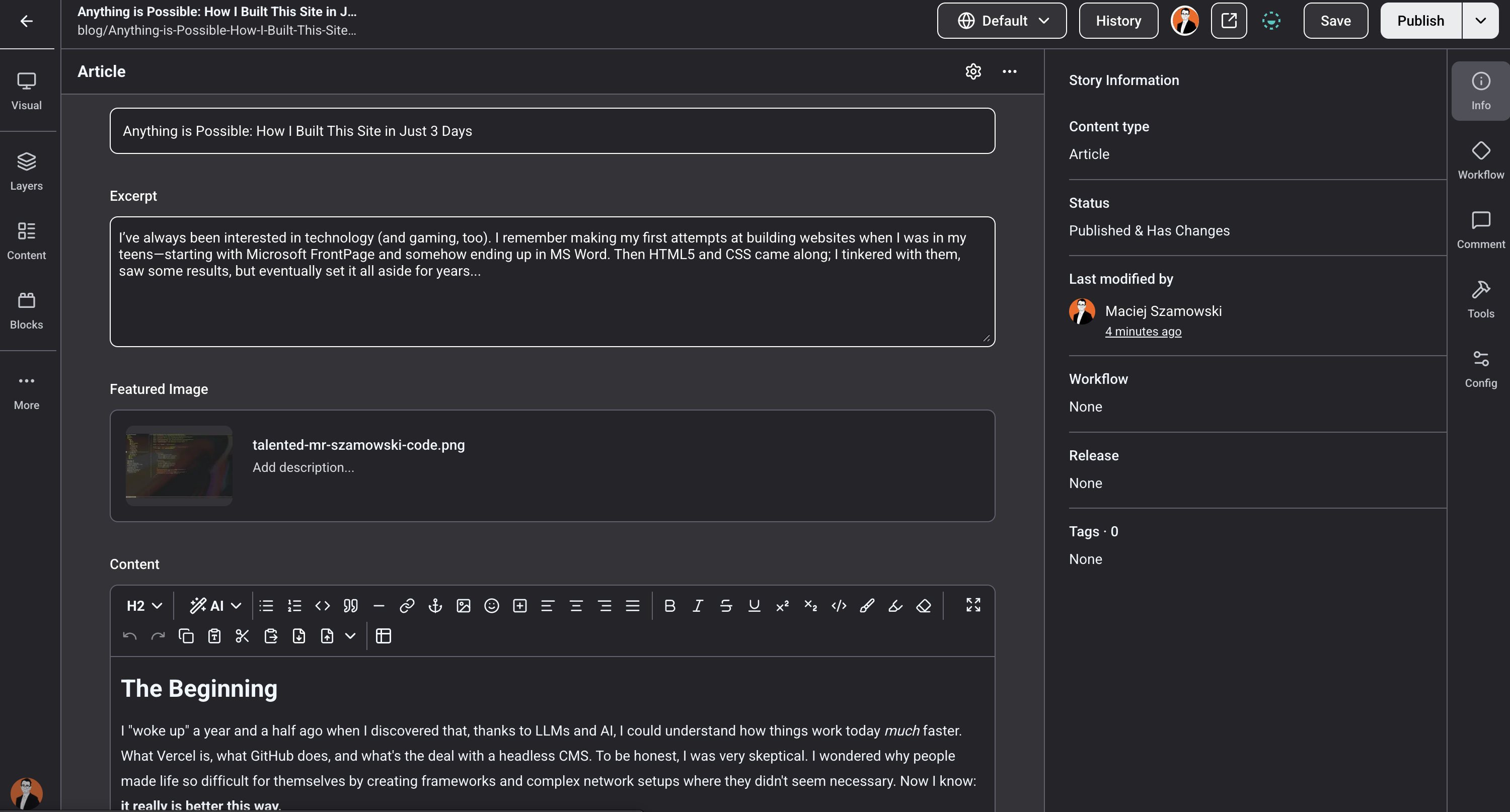 I "woke up" a year and a half ago when I discovered that, thanks to LLMs and AI, I could understand how things work today much faster. What Vercel is, what GitHub does, and what's the deal with a headless CMS. To be honest, I was very skeptical. I wondered why people made life so difficult for themselves by creating frameworks and complex network setups where they didn't seem necessary. Now I know: it really is better this way.
