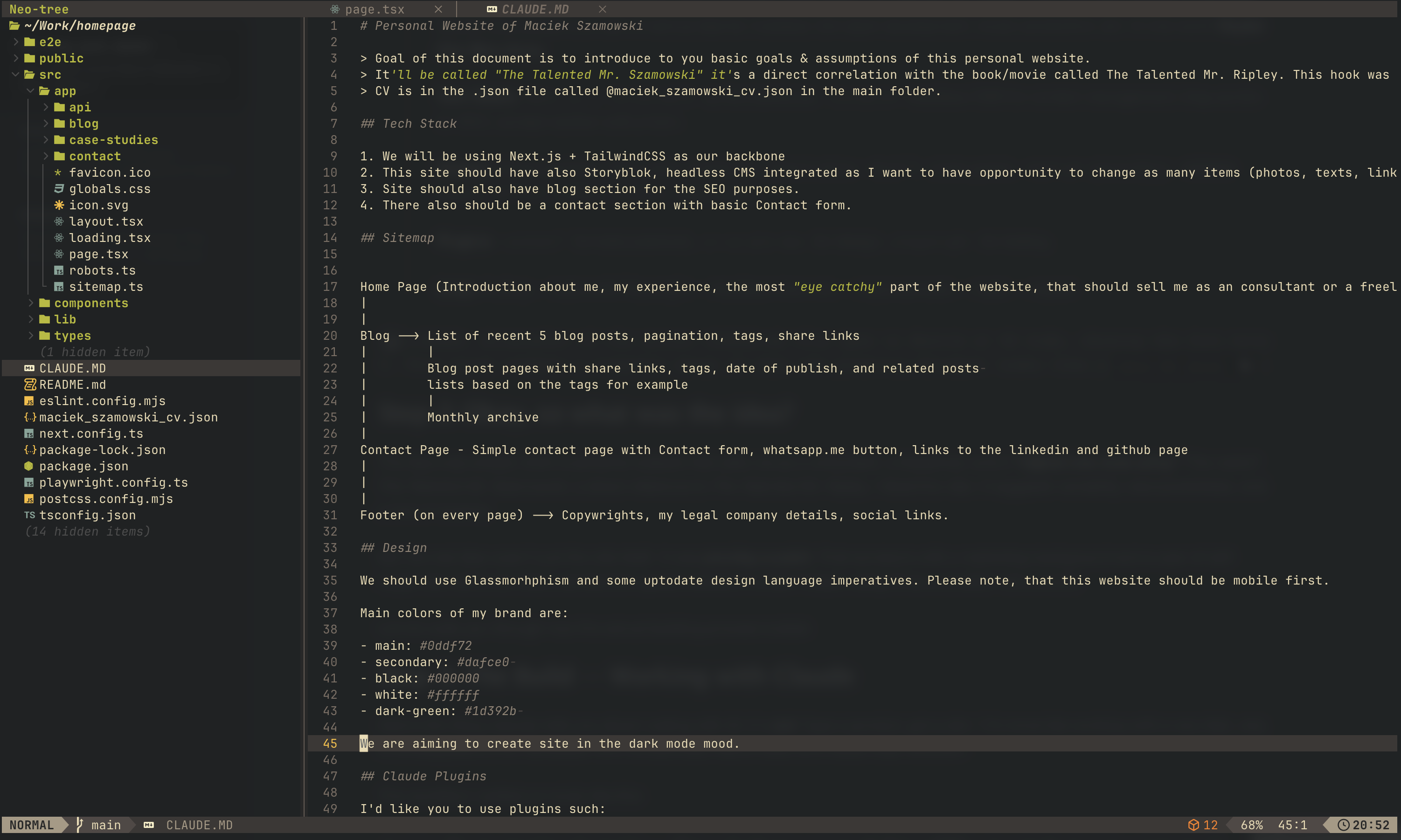 The initial scaffold came together fast. Next.js project setup, TailwindCSS config, folder structure, routing, all done in the first session. Claude is genuinely great at this kind of structural work. It knows the conventions, it follows them, and if you point it to context7, it stays up to date with the latest API changes.